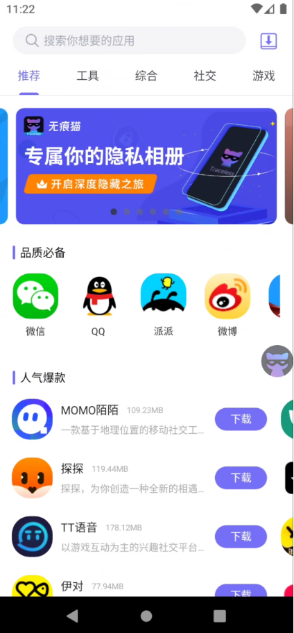 打开无痕猫内【应用市场】,搜索需要的app下载即可。