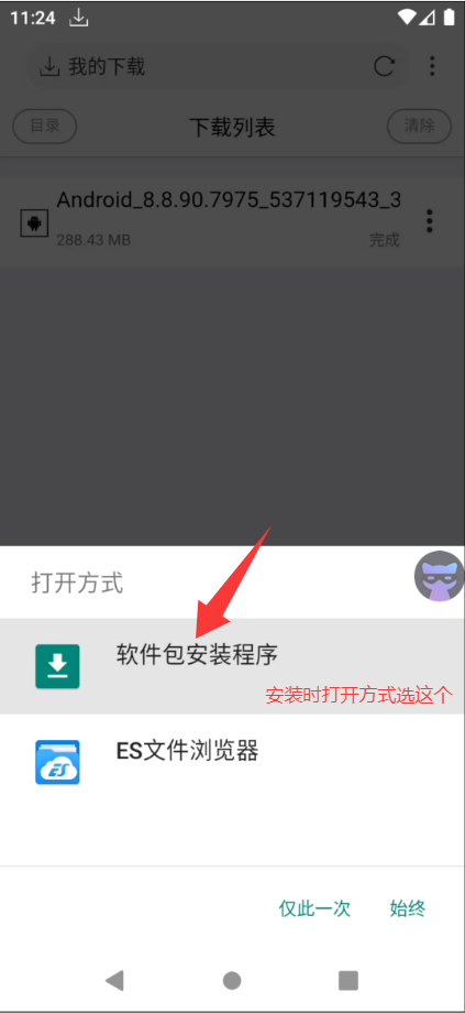 3、安装时的打开方式选第一种【软件安装包程序】,不要选ES文件浏览器。